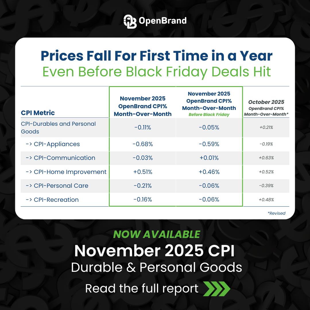 OpenBrand CPI shows durable and personal goods inflation turned negative in November (–0.11%) even before Black Friday and Cyber Monday discounts.